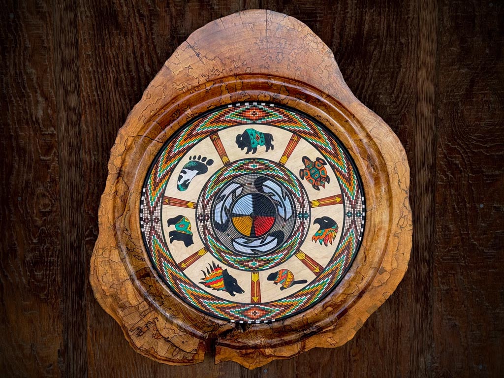 The basketweave illusions were inspired by Native American basketry. These bowls contain thousands of pieces. The end product looks like it is woven. The Acoma, Navajo, and Wounaan (South America) Indian designs have influenced Rich’s designs. The designs are all natural wood colors with no dyes or ink.