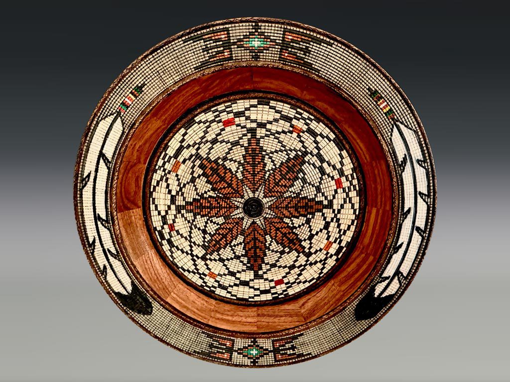 The basket illusions were inspired by Native American basketry. These bowls contain thousands of pieces. The end product looks like it is woven. The Acoma, Navajo, and Wounaan (South America) Indian designs have influenced Rich’s designs. Many of these designs have been inked.